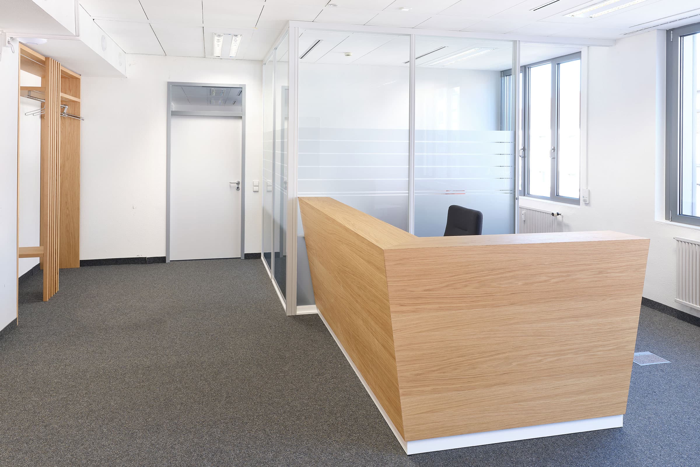 Für dieses moderne Bürogebäude wurde die Innenausstattung der Holzelemente geplant und umgesetzt. Entstanden sind maßgefertigte Möbel und Einbauten, die Funktionalität, Ergonomie und Design optimal miteinander verbinden. Hochwertige Materialien, klare Linien und präzise Verarbeitung prägen das Erscheinungsbild der Arbeitsbereiche und Gemeinschaftszonen. So wurde eine Arbeitsumgebung geschaffen, die Professionalität ausstrahlt und zugleich ein angenehmes, langlebiges Raumgefühl vermittelt.